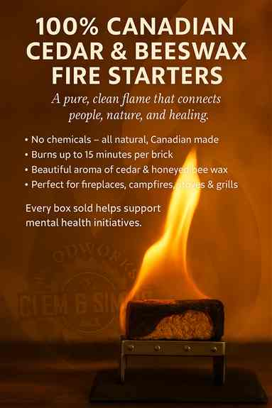 Clem & Simms Woodworks Inc. is a Saskatchewan-based company crafting premium cedar and beeswax fire starters using 100% Canadian materials. Our fire starters are clean-burning, long-lasting, and safe for indoor and outdoor use with no petroleum waxes, no chemical fillers, and no imports.Handcrafted from reclaimed Western Red Cedar sawdust and natural beeswax, each brick lights easily, burns hot, and smells incredible. We believe fire is more than heat, it’s a ritual, a moment to slow down, and a way to reconnect. One Match. One Brick. One Fire.