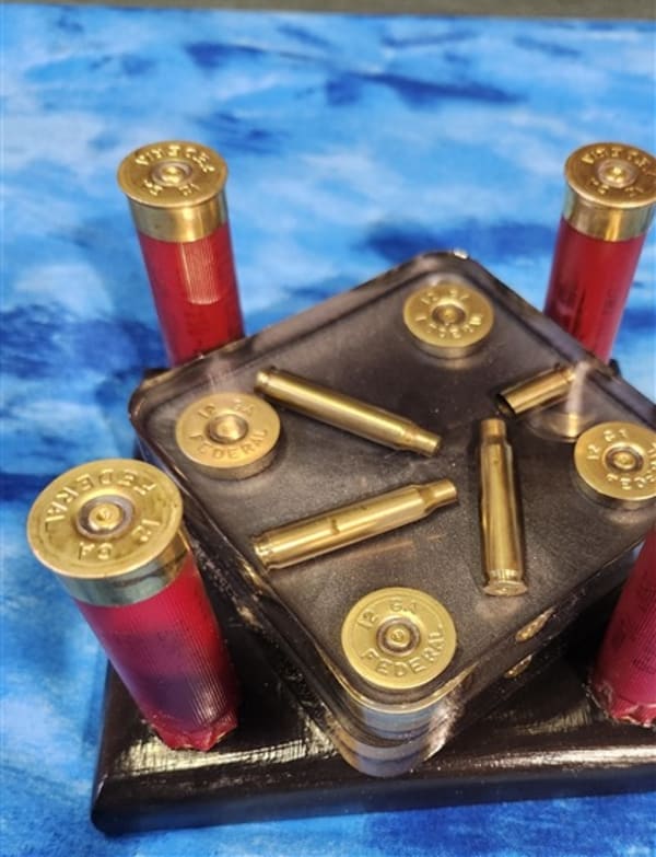 Coasters hi-lighting hunting and fishing. Coat racks with rustic and resin mix. Jewelry made from spent rifle shells.